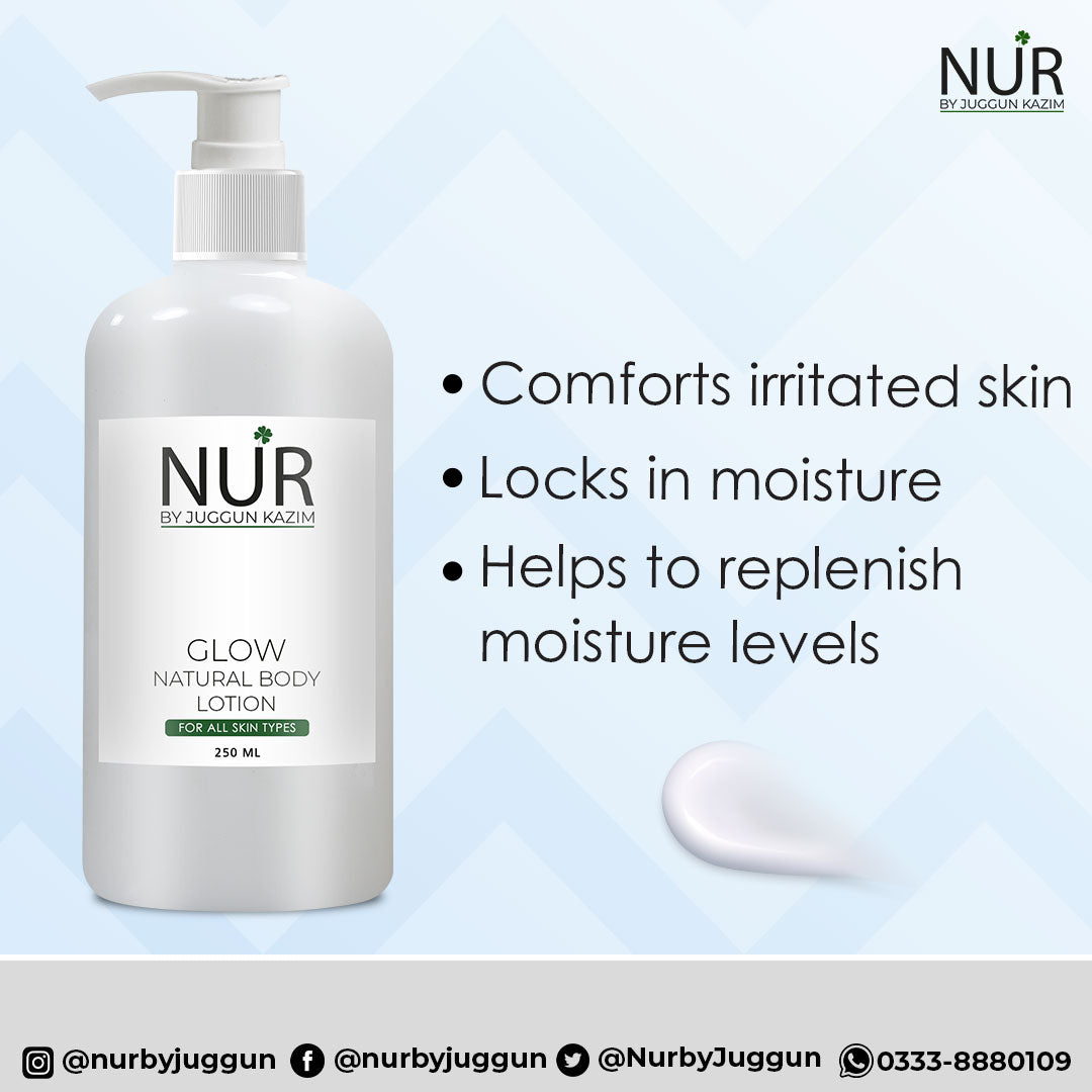 NUR Glow Natural Body Lotion hydrate face moisturizer to add moisture to dry skin and help keep it from drying out again. Cold weather or hot weather, air conditioning or indoor heat. All of these environmental factors can suck the moisture right out of your skin That’s where a good moisturizer comes in. It not only replaces moisture that’s already been lost but helps prevent future loss. Hydrated skin is younger-looking skin. Glow Face & Body Lotion prevent future fine lines and wrinkles.