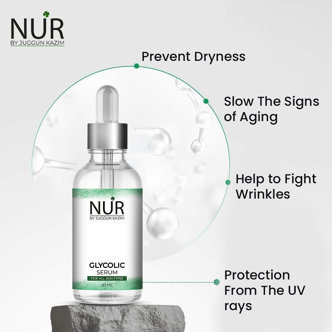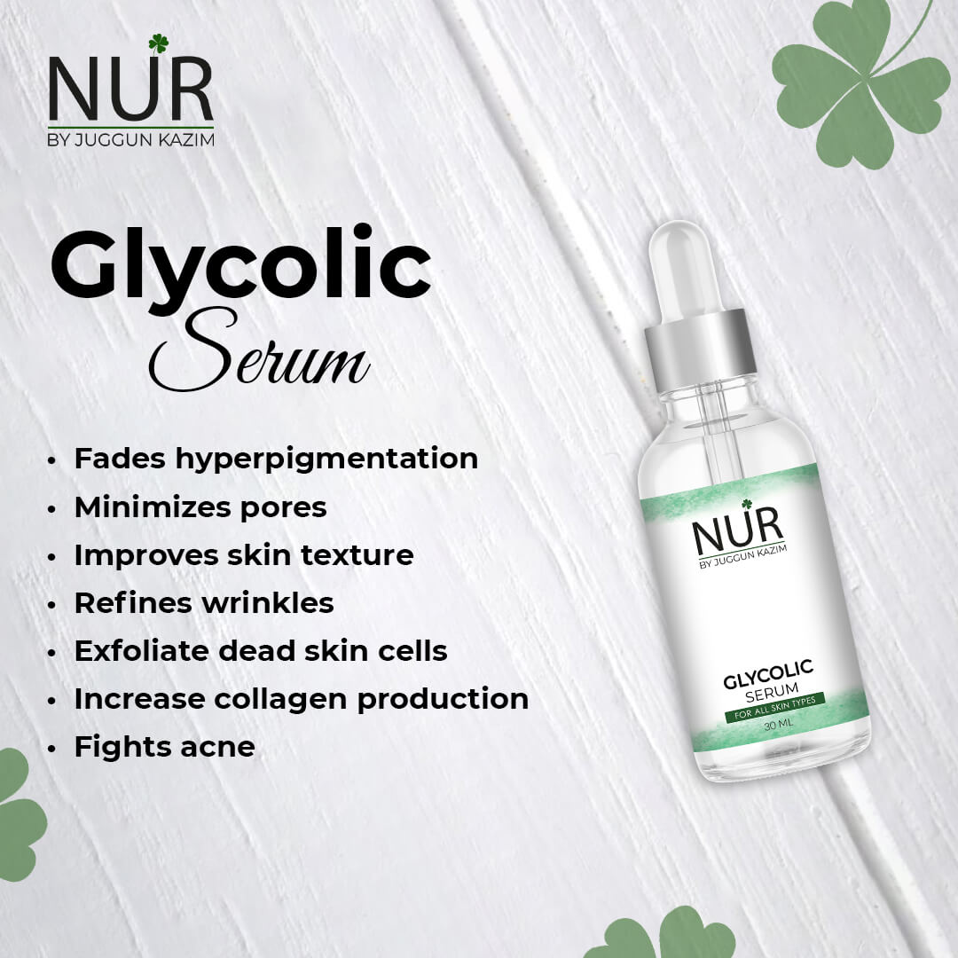 Glycolic acid serums are used for exfoliation, effectively removing the outermost layer of dead cells from the face in order to brighten the skin. Products containing glycolic acid are used often to treat scarring, discoloration, and signs of aging, such as wrinkles or fine lines.